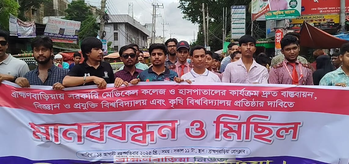 ব্রাহ্মণবাড়িয়ায় মেডিকেল কলেজ বাস্তবায়ন ও বিশ্ববিদ্যালয় প্রতিষ্ঠার দাবিতে বিক্ষোভ মিছিল