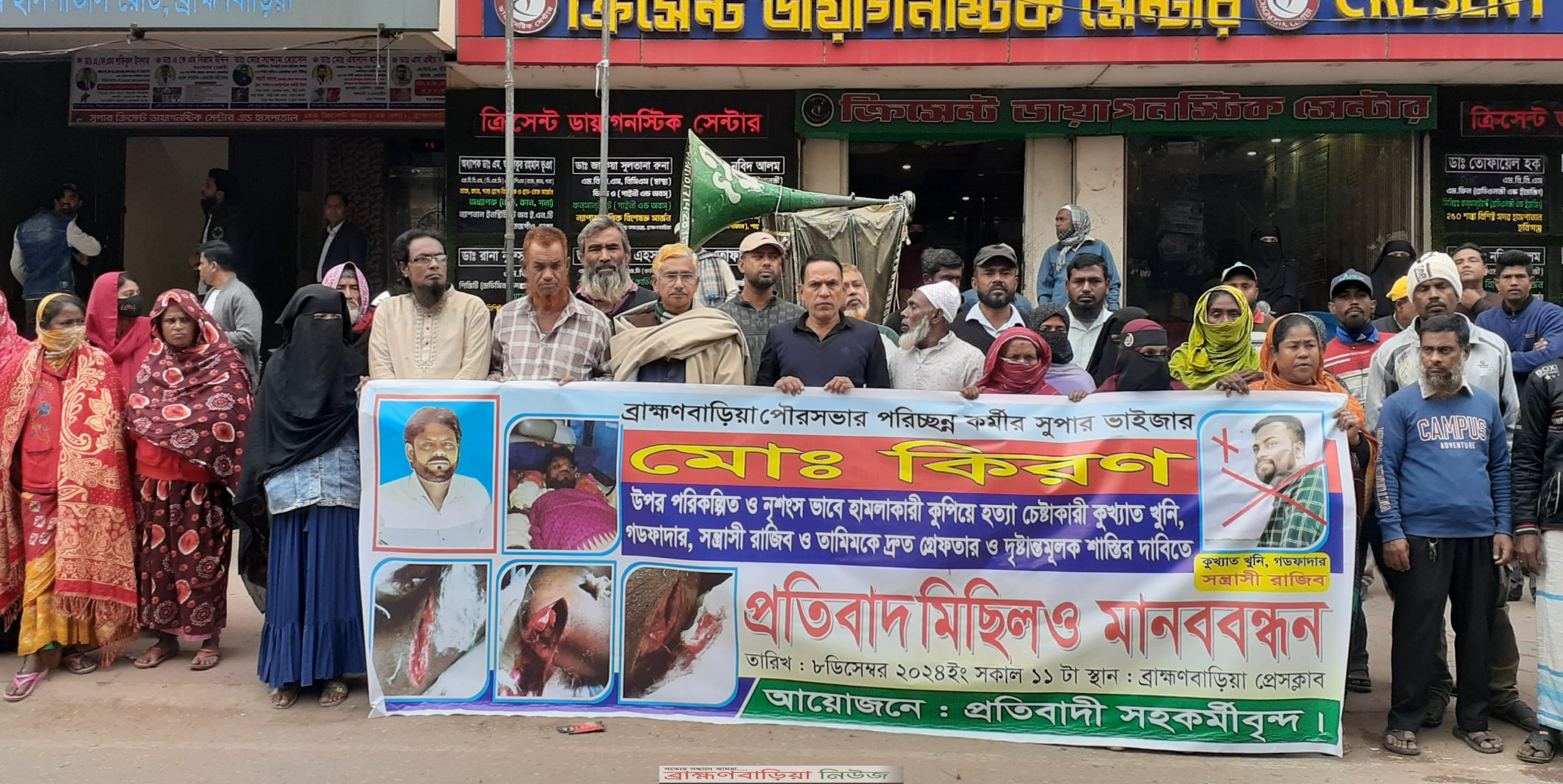 পৌর কর্মচারীর উপর হামলাকারীদের গ্রেফতারের দাবিতে ব্রাহ্মণবাড়িয়ায় প্রতিবাদ মিছিল